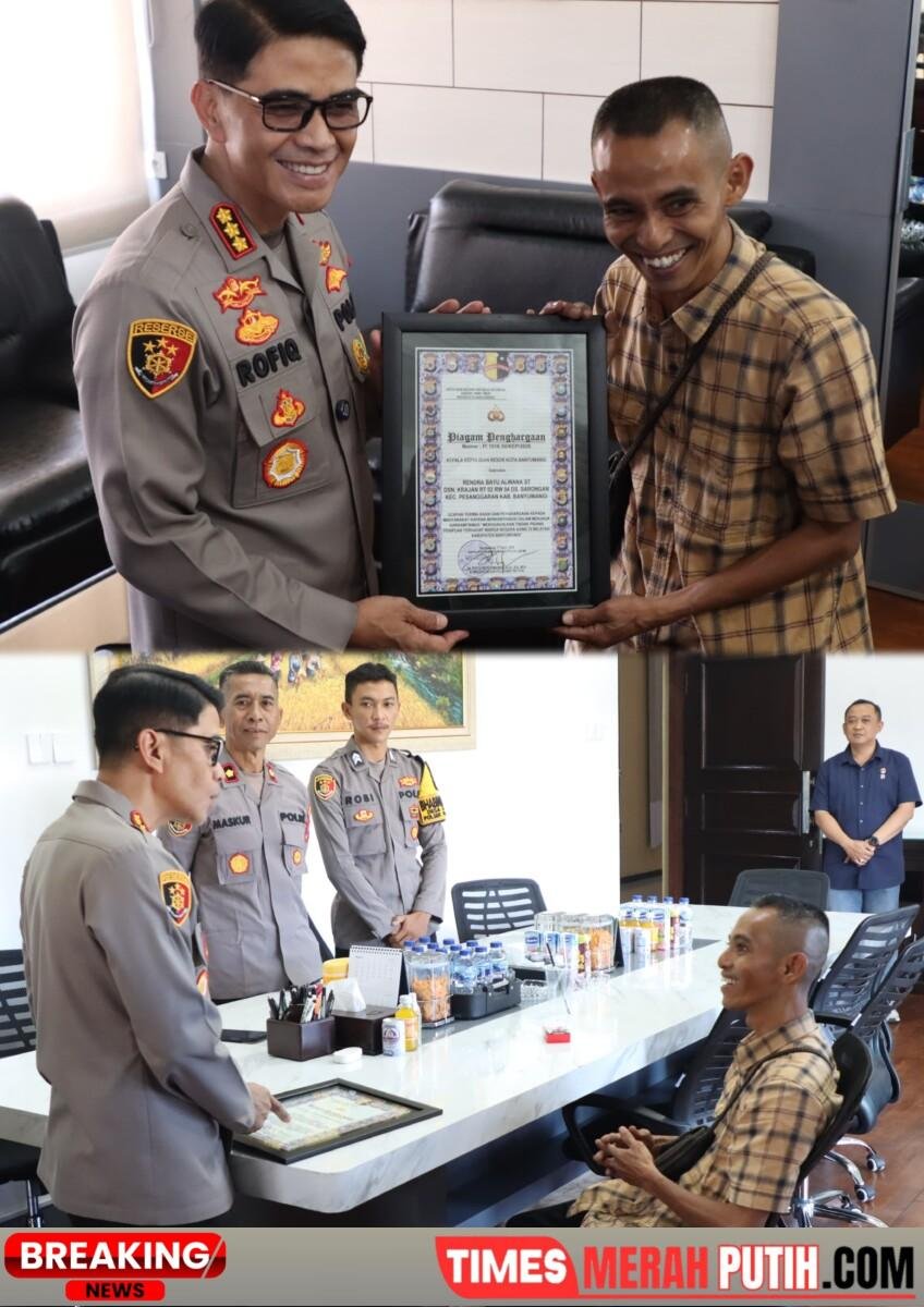 BANYUWANGI – Times Merah putih.com//Kapolresta Banyuwangi, Kombes Pol Dr. Rofiq Ripto Himawan, S.I.K., S.H., M.H., secara resmi menyerahkan piagam penghargaan kepada Rendra Bayu Alwana, seorang warga Sarongan, pada Rabu (15/4/2026).