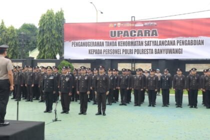 Banyuwangi –Times Merah Putih.com//Kapolresta Banyuwangi Kombes Pol. Dr. Rofiq Ripto Himawan, S.I.K., S.H., M.H., memimpin upacara penganugerahan Tanda Kehormatan Satyalancana Pengabdian kepada anggot...