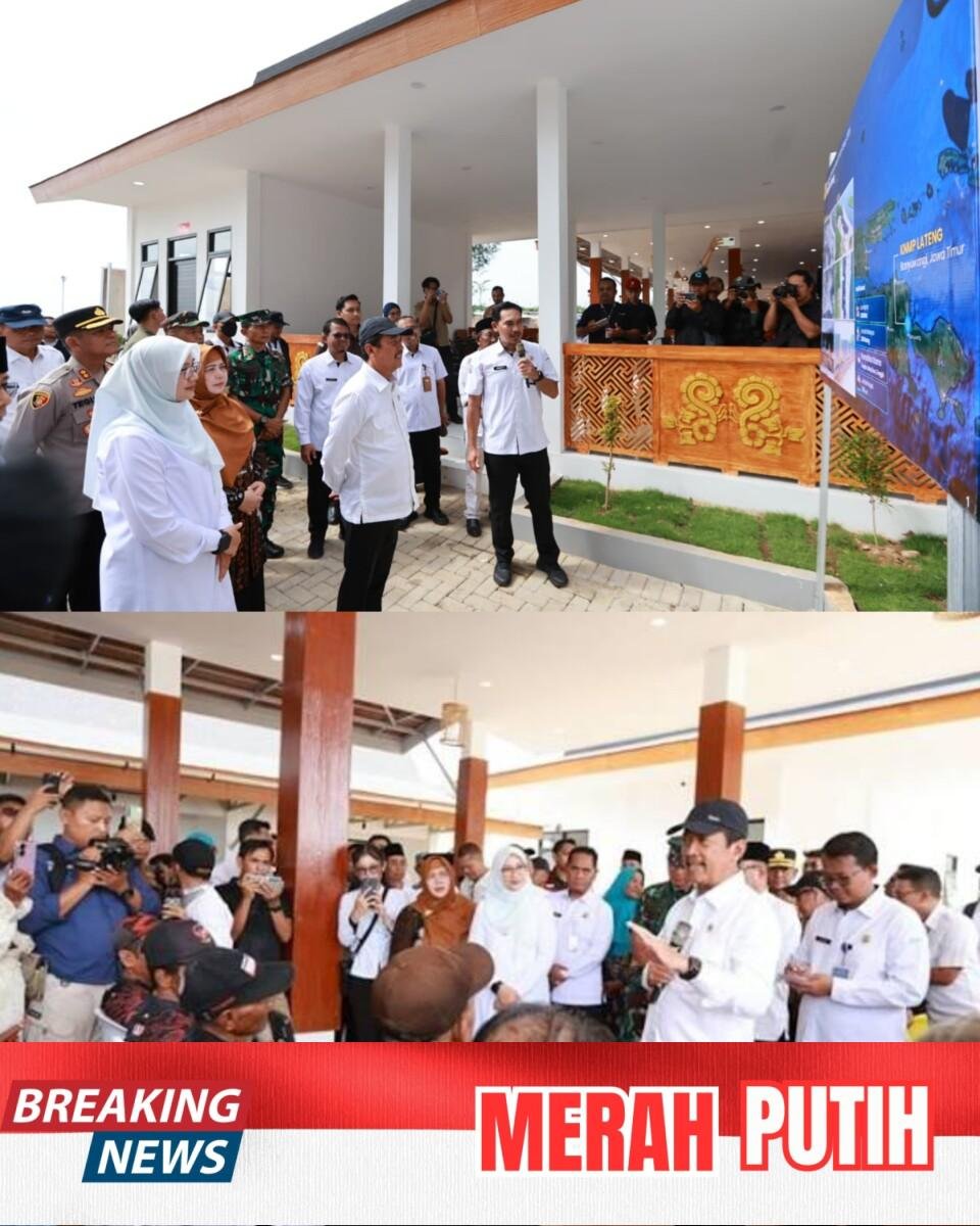 BANYUWANGI – Menteri Kelautan dan Perikanan (KP) RI, Sakti Wahyu Trenggono, tinjau progres pembangunan Kampung Nelayan Merah Putih (KNMP) Lateng di kawasan pesisir plengsengan Ancol, Kelurahan Lateng, Banyuwangi, Selasa (3/3/2026). KNMP Lateng yang dibangun mengusung arsitektur Osing ini, akan menjadi kawasan kampung nelayan modern yang menjadi program strategis nasional Presiden Prabowo Subianto.
