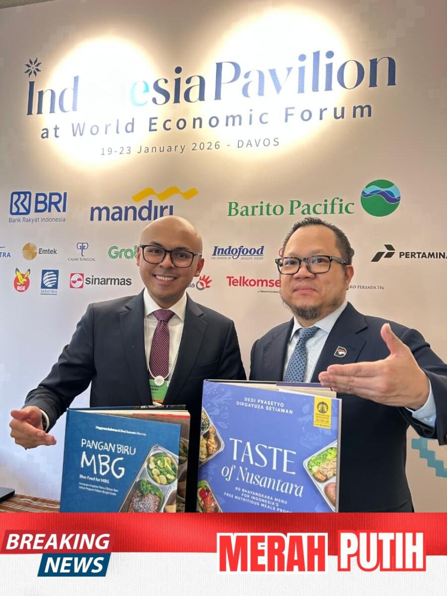 “Saya menyerahkan buku Rasa Bhayangkara Nusantara versi Bahasa Inggris kepada Bapak Stefanus Ade Hadiwidjaja, Managing Director, Investment, Danantara Indonesia, untuk ditampilkan di Paviliun Indonesia pada WEF Davos 2026 sebagai bagian dari showcase diplomasi MBG dan khazanah rasa Nusantara,” ujar Dirgayuza Setiawan.