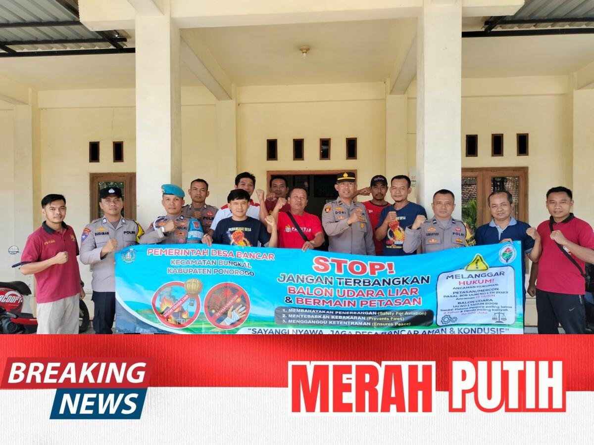 PONOROGO –Times Merah putih.com//Upaya menciptakan situasi yang aman dan kondusif terus digalakkan oleh jajaran Polsek Bungkal bersama Pemerintah Desa Bancar Kecamatan Bungkal Kabupaten Ponorogo. Guna menjamin keamanan dan ketertiban masyarakat (Kamtibmas), Pemerintah Desa Bancar, bersama Polsek Bungkal secara resmi memperketat pengawasan terhadap aktivitas pembuatan mercon (petasan) serta penerbangan balon udara tanpa awak. Langkah ini diambil menyusul adanya bukti nyata kerusakan fisik dan korban luka di wilayah lain.