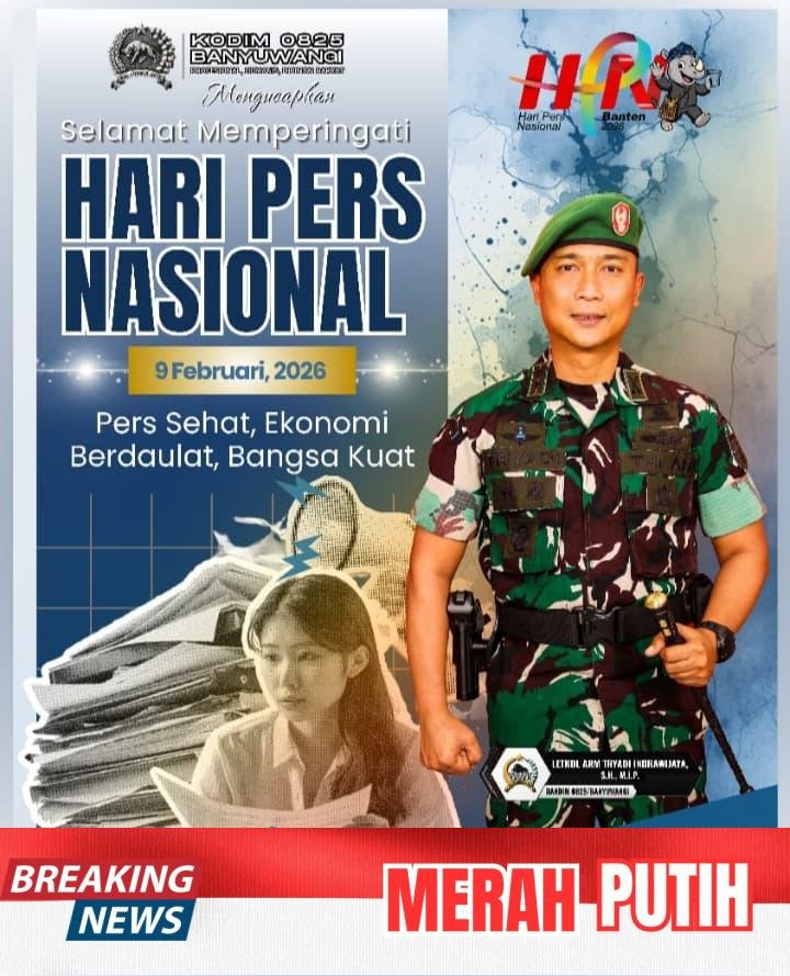 Banyuwangi – Times merah Putih.com//Komandan Kodim (Dandim) 0825/Banyuwangi, Letkol (Arm) Triyadi Indrawijaya, S.H., M.I.P., menyampaikan ucapan selamat memperingati Hari Pers Nasional (HPN) 2026 yang diperingati setiap tanggal 09 Februari. Ucapan tersebut ditujukan kepada seluruh insan pers di Indonesia, khususnya para jurnalis yang bertugas di wilayah Kabupaten Banyuwangi.
