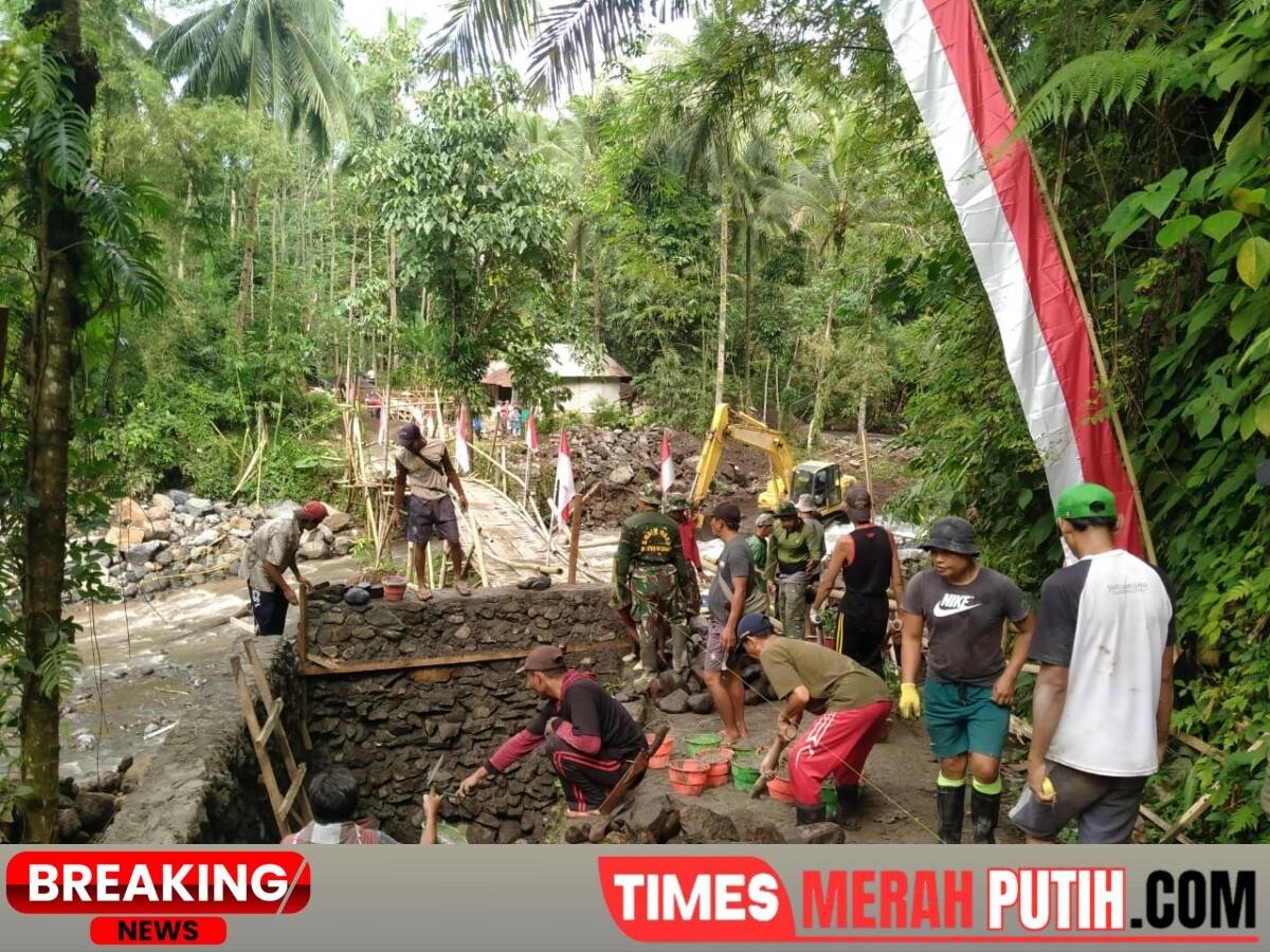 Banyuwangi – Timesmerahputih.com | Pagi masih berembun ketika Kapten Kav Andoko, Komandan Koramil 0825/20 Songgon, telah berdiri tegap memimpin apel kerja di tepi Sungai Binau, Dusun Krajan, Desa Songgon, Jumat (03/04/2026). Tepat pukul 07.00 WIB, peluit dibunyikan, dan hari ke-6 Karya Bakti TNI Pembangunan Jembatan Perintis Garuda Tahap III Kodim 0825/Banyuwangi resmi bergulir. Bukan sekadar rutinitas — ini adalah panggung nyata kemanunggalan TNI dan rakyat yang setiap harinya semakin mengeras, seperti cor beton yang terus mereka tuangkan ke dalam pondasi.