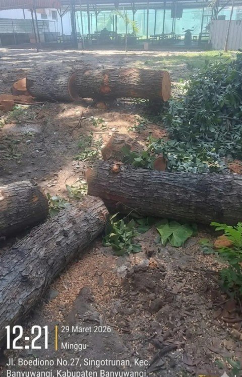 BANYUWANGI —Times Merah putih.com//Suara gergaji mesin memecah keheningan di Jl. Boediono No.27, Kelurahan Singotrunan. Namun yang terpotong bukan sekadar batang pohon melainkan juga rasa kepercayaan publik terhadap kepastian hukum.
