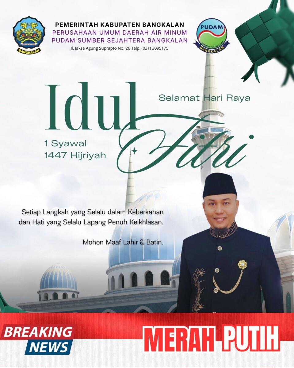 BANGKALAN — Menyambut datangnya Hari Raya Idul Fitri 1447 Hijriyah / 2026 Masehi, Direktur Perusahaan Umum Daerah Air Minum (PUDAM) Sumber Sejahtera Kabupaten Bangkalan, H. Sobirin Hasan, S.E., MBA, menyampaikan ucapan selamat kepada seluruh masyarakat.
