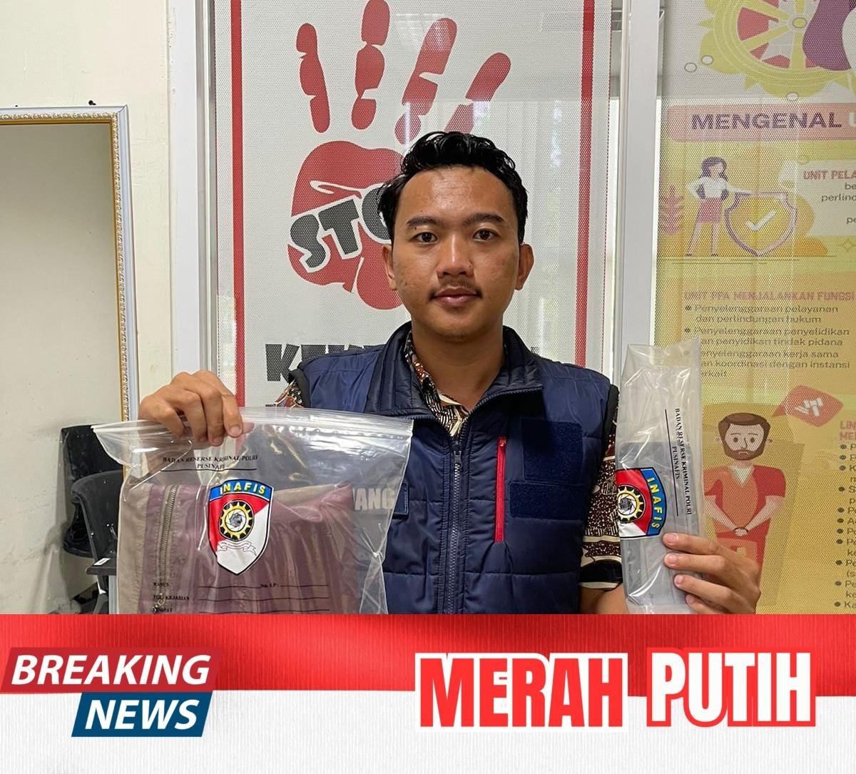 Dari tangan pelaku, Polisi turut mengamankan sejumlah barang bukti, di antaranya jaket warna coklat kombinasi merah tua, baju ketelpak warna biru muda, sepeda motor Honda PCX putih nopol W 4150 FU, helm hitam, Handphone, Rekaman CCTV di sekitar TKP.