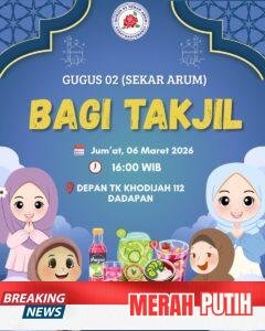 Banyuwangi –Times merah putih.com//Dalam rangka mempererat tali silaturahmi dan berbagi berkah di bulan suci Ramadan, Gugus 02 Sekar Arum menggelar kegiatan bagi-bagi takjil gratis. Kegiatan tersebut dilaksanakan pada Jumat, 6 Maret 2026, di depan TK Khodijah 112 Desa Dadapan, Kecamatan Kabat, Banyuwangi.