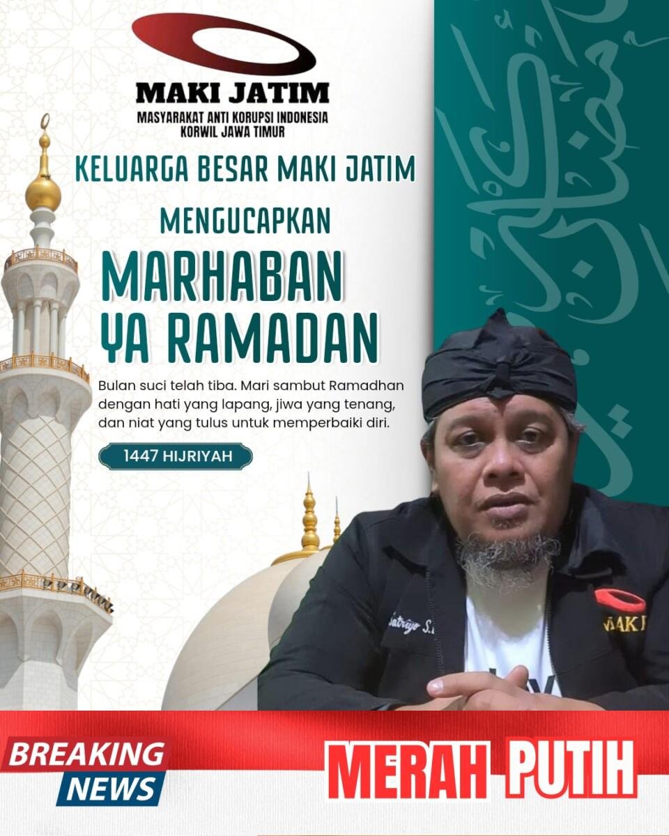 Keluarga Besar Masyarakat Anti Korupsi Indonesia Jawa Timur (MAKI Jatim) menyambut bulan suci ini dengan penuh syukur seraya mengucapkan, Marhaban Ya Ramadan. Sebuah sapaan hangat yang bermakna: selamat datang wahai bulan yang membawa rahmat, ampunan, dan keberkahan.