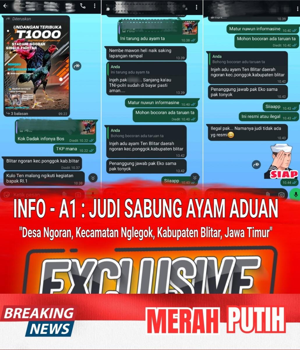 Dari informasi tersebarnya berbagai awak media sekitar Kabupaten Blitar dan Kota, hingga juga tersebar di Group Whatsapp Wartawan Liputan Polda Jatim, sempat terjadi Chat Whatsapp seseorang (narasumber) yang membocorkan agenda “Judi Adu Ayam” Stadion Ngaron, Desa Ngoran, Kecamatan Nglegok, Kabupaten Blitar, Jawa Timur, (Red-nama tidak mau terexpose media).
