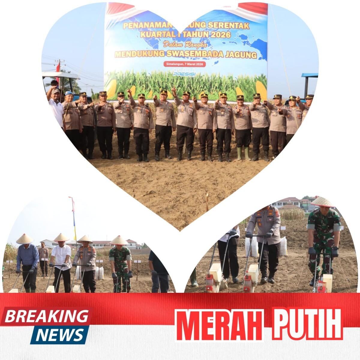 “Kekompakan Forkopimda Simalungun benar-benar terwujud dalam kegiatan penanaman jagung serentak kuartal I tahun 2026. Kapolres Simalungun AKBP Marganda Aritonang, SH, SIK, MM., Dandim 0207/Simalungun Letkol Inf. Gede Agus Dian Pringgana, S.Sos, MMAS, M.HAN., dan Ketua DPRD Simalungun Sugiarto, SH., bersama-sama memimpin penanaman jagung secara simbolis di Nagori Purba Sari, Kecamatan Tapian Dolok. Kegiatan dilaksanakan pada hari Sabtu, 7 Maret 2026, mulai pukul 15.00 WIB hingga selesai,” ungkap Kasi Humas AKP Verry Purba menekankan kekompakan.