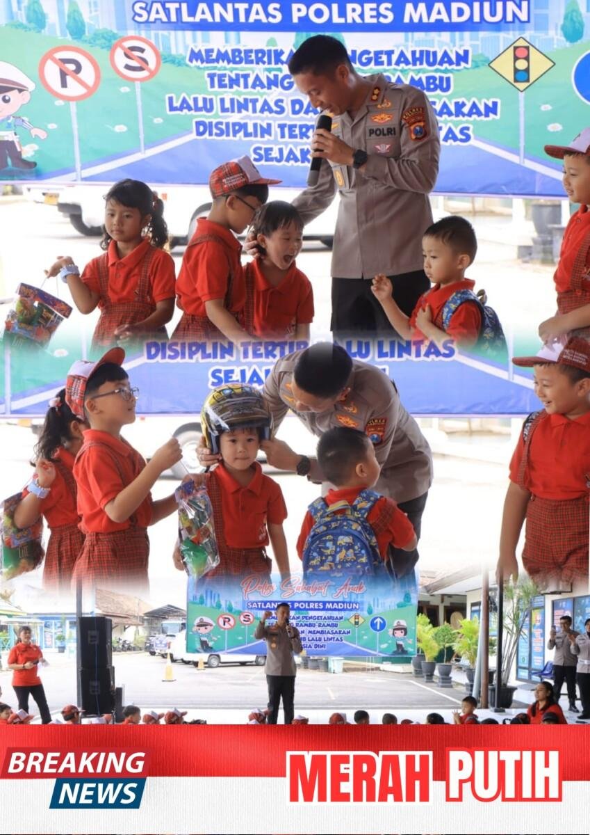 MADIUN –Times Merah Putih.com//Satlantas Polres Madiun menggelar kegiatan Polantas Menyapa Polsanak (Polisi Sahabat Anak) sebagai bentuk pendekatan edukatif kepada anak-anak dalam rangka menanamkan kesadaran tertib berlalu lintas sejak usia dini di Tribun Lantas Polres Madiun, Selasa (27/01/2026).