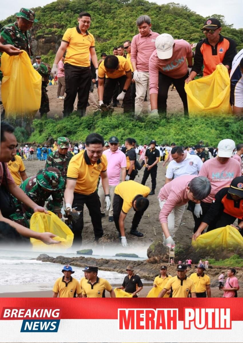 Sejumlah Pejabat Utama Polres Jember, Muspika Kabupaten Jember yang terdiri dari unsur TNI, pemerintah kecamatan, desa, serta elemen masyarakat menyisir dan membersihkan sampah di pesisir pantai.