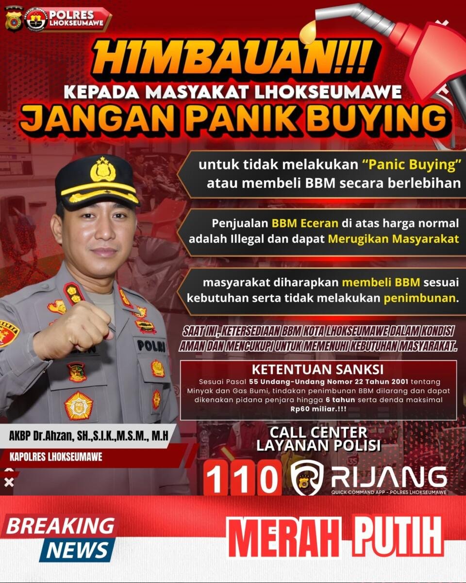 Lhokseumawe —Times Merah putih.com//Polres Lhokseumawe mengimbau masyarakat agar tidak melakukan panic buying atau membeli bahan bakar minyak (BBM) secara berlebihan, kamis (6/3/2026). Imbauan tersebut disampaikan sebagai upaya menjaga stabilitas distribusi BBM serta mencegah terjadinya kelangkaan di tengah masyarakat.