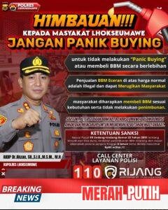 Lhokseumawe —Times Merah putih.com//Polres Lhokseumawe mengimbau masyarakat agar tidak melakukan panic buying atau membeli bahan bakar minyak (BBM) secara berlebihan, kamis (6/3/2026). Imbauan tersebut disampaikan sebagai upaya menjaga stabilitas distribusi BBM serta mencegah terjadinya kelangkaan di tengah masyarakat.