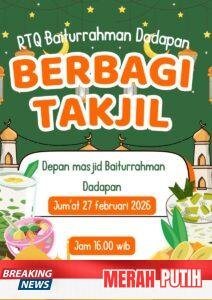DADAPAN KAbAT–Times Merah putih.com// tgl 27-02-2026.Roudlotut Tarbiyyatil Qur’an ( RTQ Baiturraahman ) Desa Dadapan, Kecamatan Kabat, Kabupaten Banyuwangi menggelar kegiatan berbagi takjil gratis di depan Masjid Jami Baiturrahman pada bulan suci Ramadhan. Kegiatan ini disambut antusias oleh masyarakat dan para pengguna jalan yang melintas.