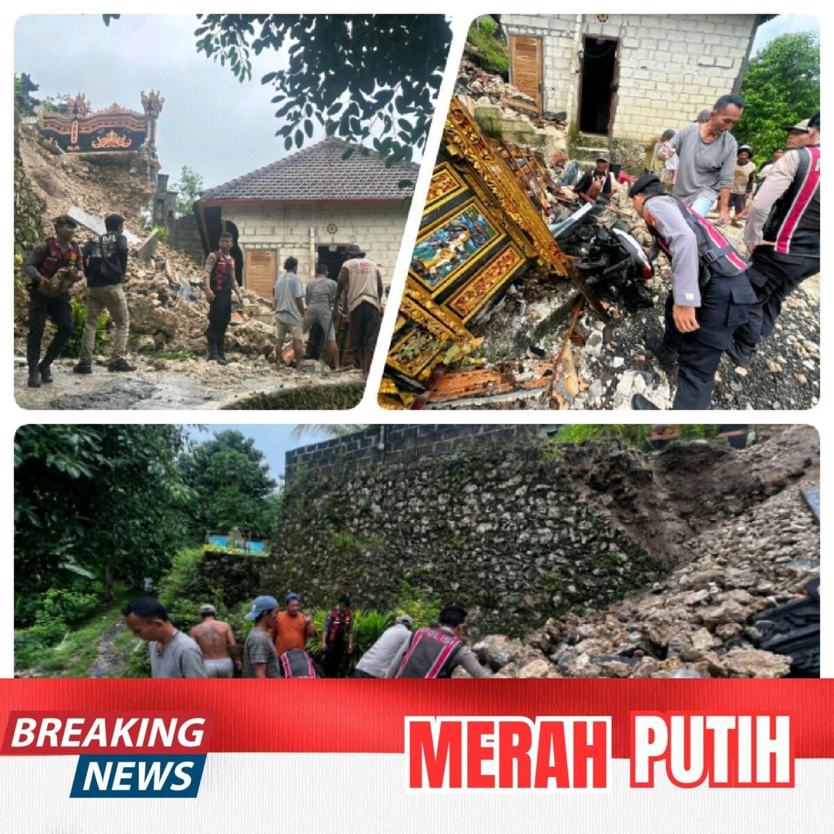 Polres Klungkung, – Times Merah putih.com//Tanah longsor terjadi di Banjar Buah, Desa Kutampi, Kecamatan Nusa Penida, Kabupaten Klungkung, pada Selasa, 24 Februari 2026, sekitar pukul 22.30 WITA. Longsor tersebut mengakibatkan amblasnya penyengker dan pelinggih pura milik warga atas nama I Ketut Terima, dan menimpa rumah serta motor milik I Kadek Dwi Putra Yasa.
