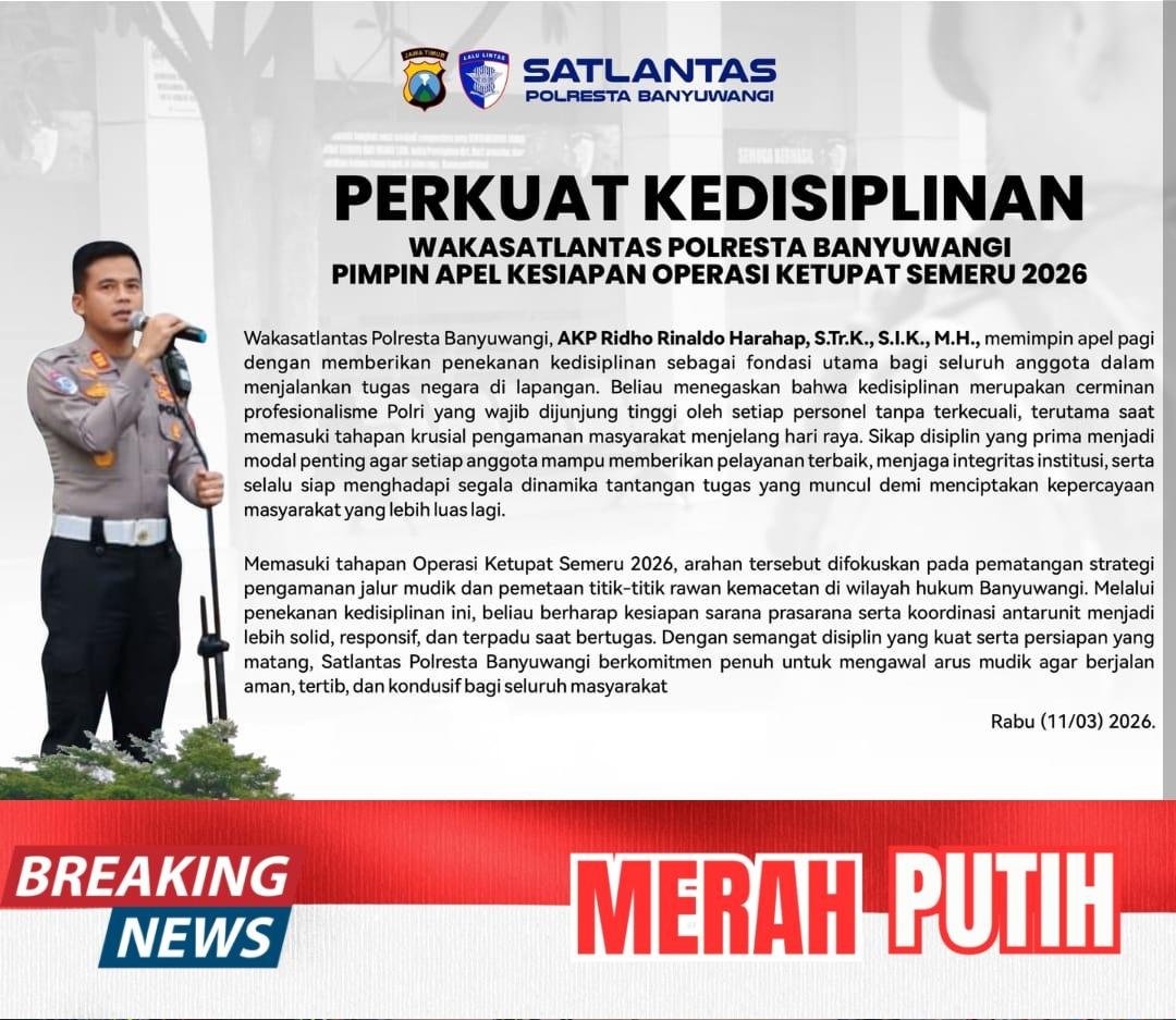 BANYUWANGI –Times Merah putih.com//Kedisiplinan menjadi kunci utama dalam menjalankan tugas sebagai aparat penegak hukum di lapangan. Hal tersebut ditegaskan oleh AKP. Ridho Rinaldo Harahap, S.Tr.K., S.I.K., M.H., selaku Wakasatlantas Polresta Banyuwangi saat memimpin apel pagi bersama jajaran anggota Satuan Lalu Lintas, Rabu pagi 11 Maret 2026